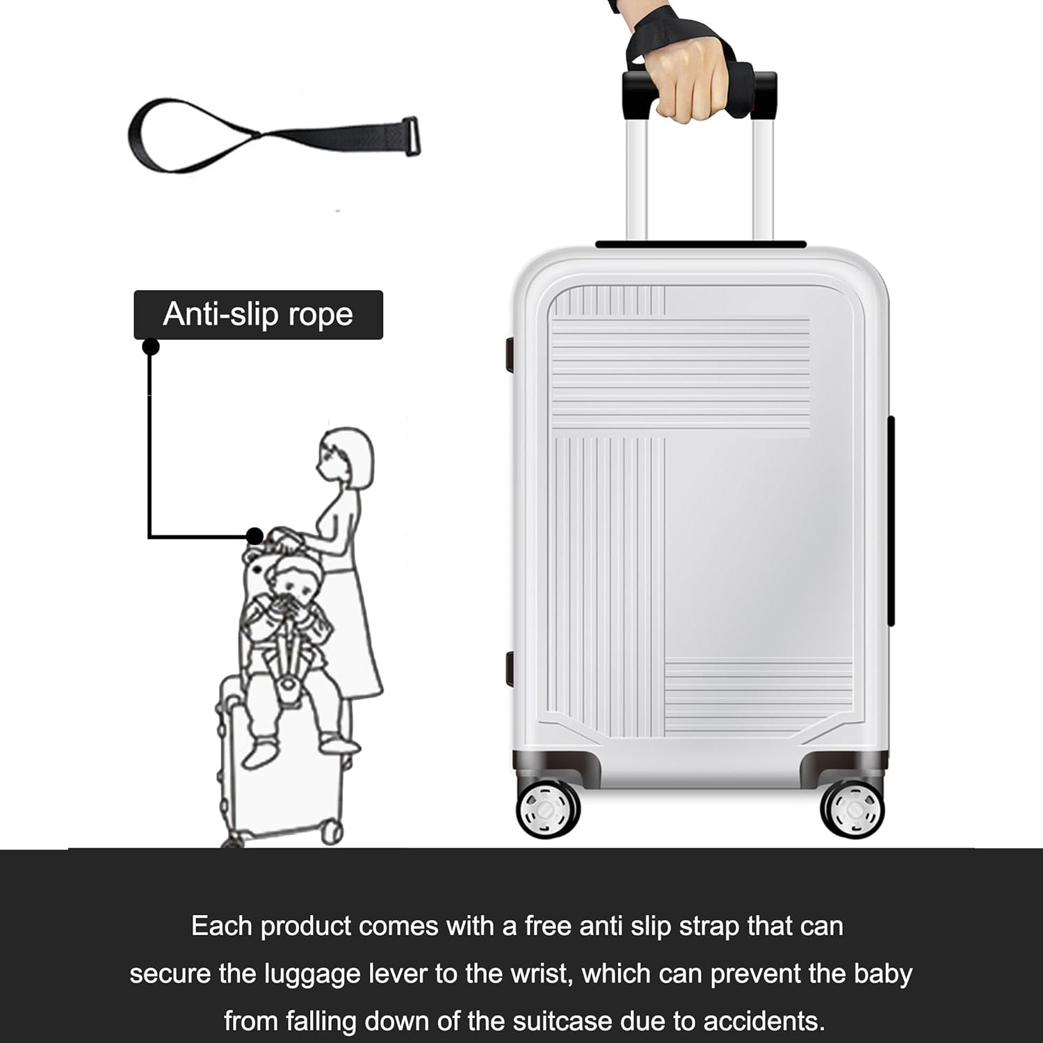 Attaches suitcase handle to your wrist – prevents accidental falls from the suitcase during travel.