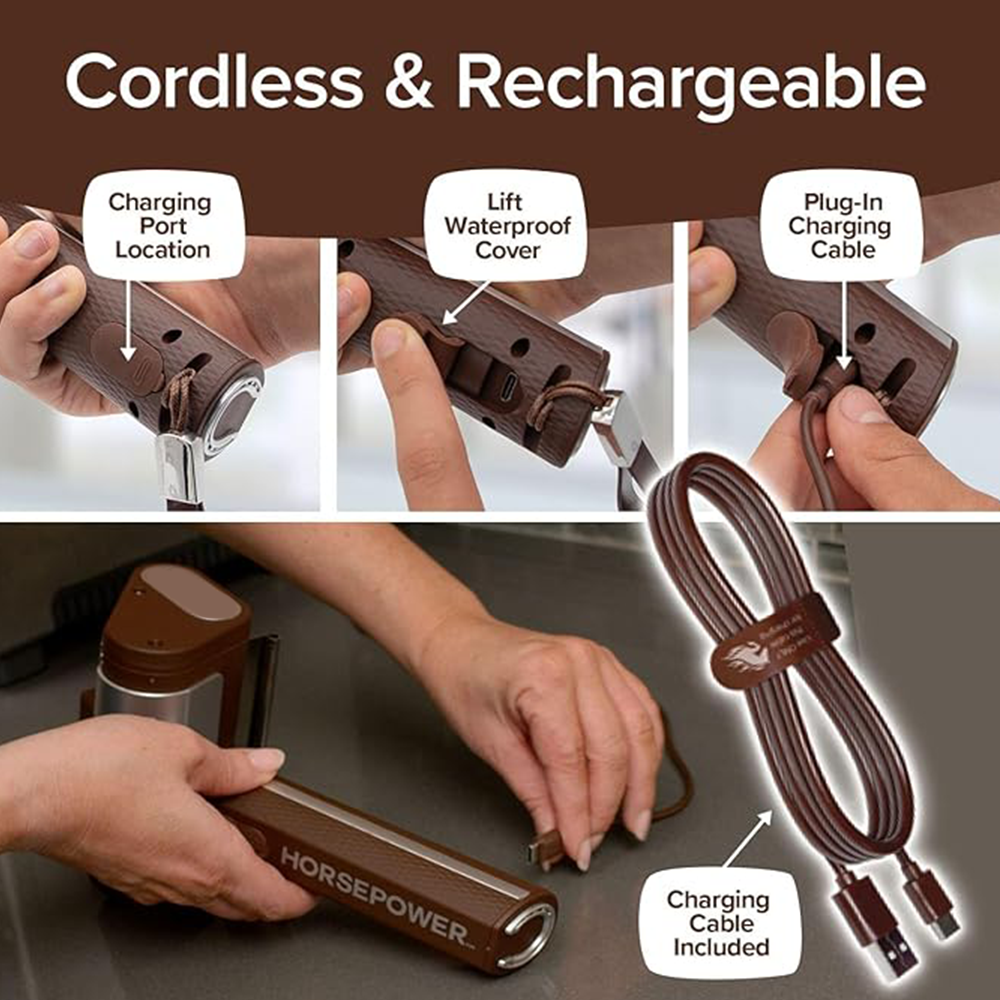 Cordless design powered by a rechargeable battery that charges via standard USB cable, providing freedom of movement around the grill.
