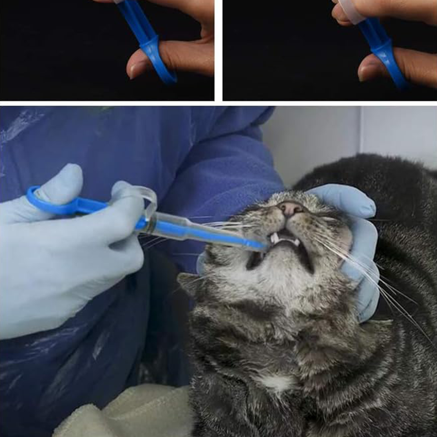 Small pet pill feeder helps safely and easily administer pills or liquid medication to pets.