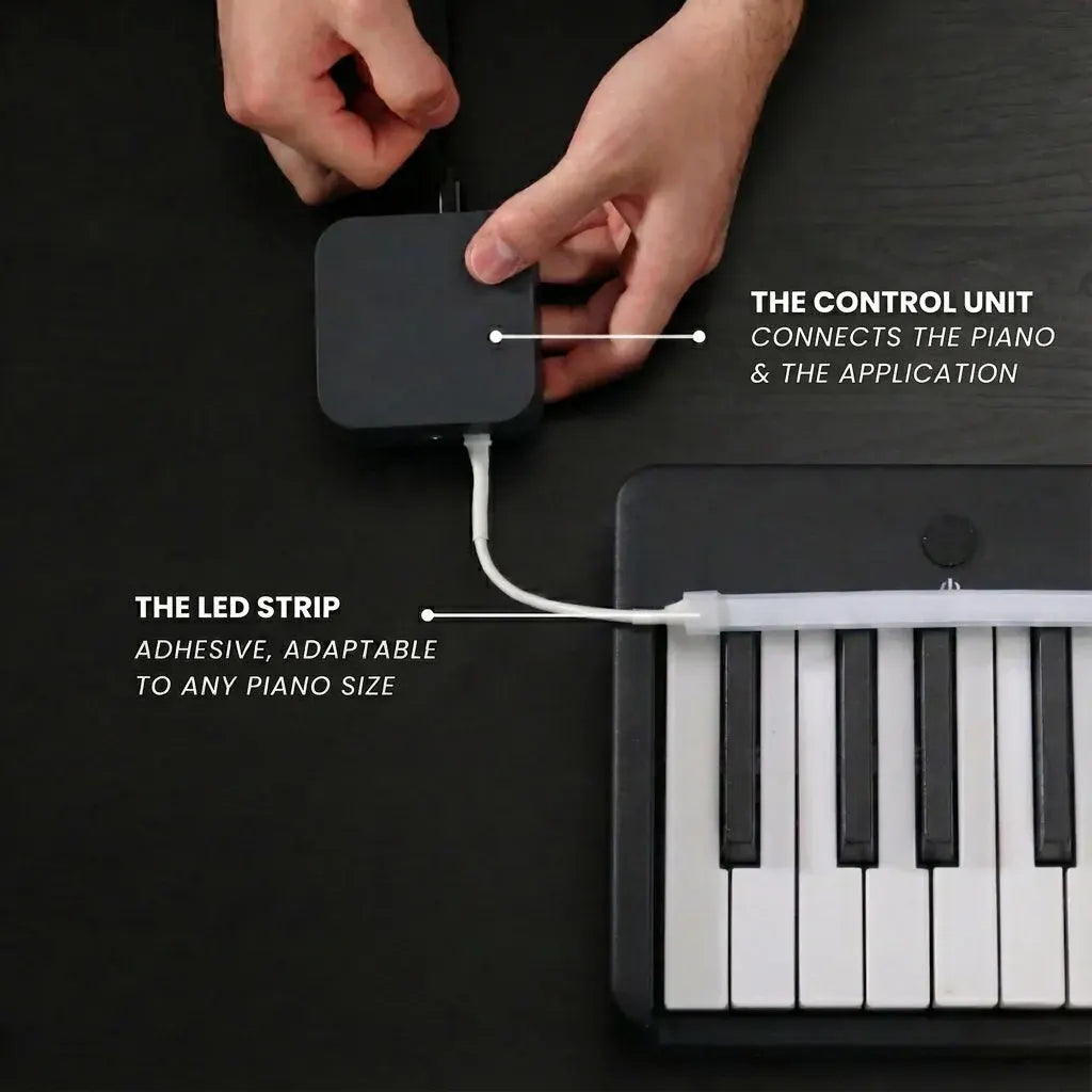 LED strip lights up key by key to guide you as you play—detects mistakes and waits for the right keys before advancing.