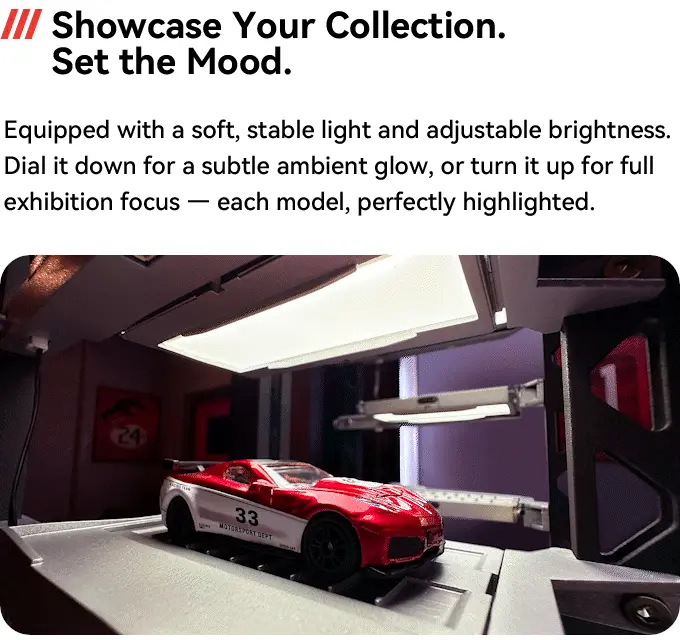 Adjustable lighting highlights each model, turning your collection into a premium showcase.