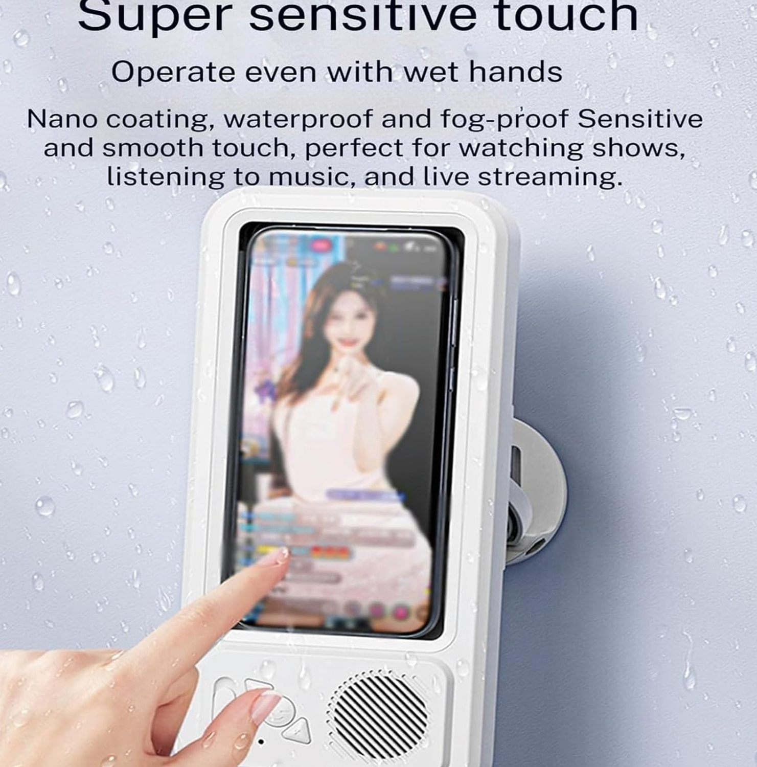 A waterproof phone holder that lets you safely use your phone in the shower or bath while retaining full touchscreen functionality.