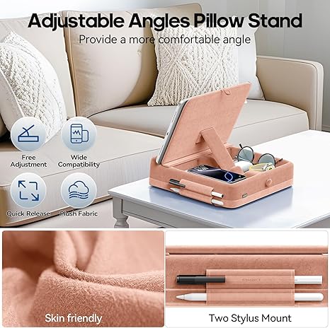 This foldable tablet pillow stand provides comfortable hands-free viewing with built-in storage for use on bed, lap, or desk.