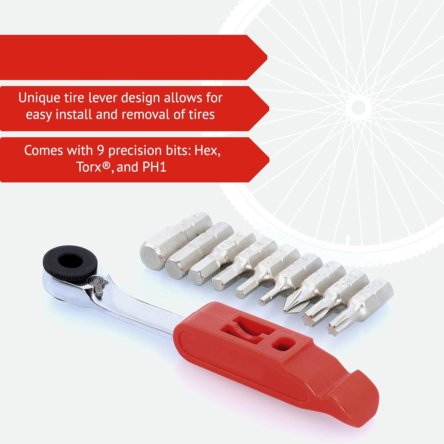 • Bit Sizes: Hex 2mm, 3mm, 4mm, 5mm, 6mm, 8mm;  T20, T25; PH1 Sliding Tire Removal Lever