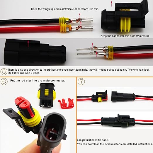 - Pin Configuration: 2-Pin, Male/Female Terminal Set