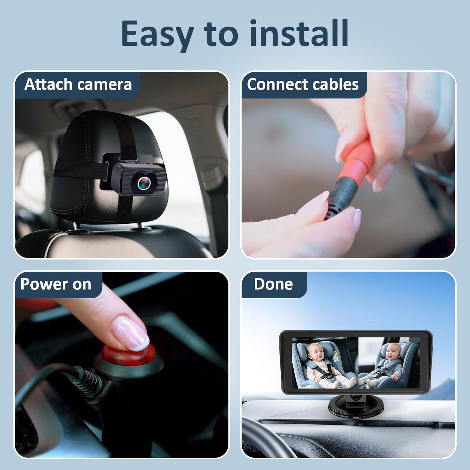 Designed for families with two kids. Dual-camera system lets you watch both children simultaneously while driving – no need to turn around or get distracted.