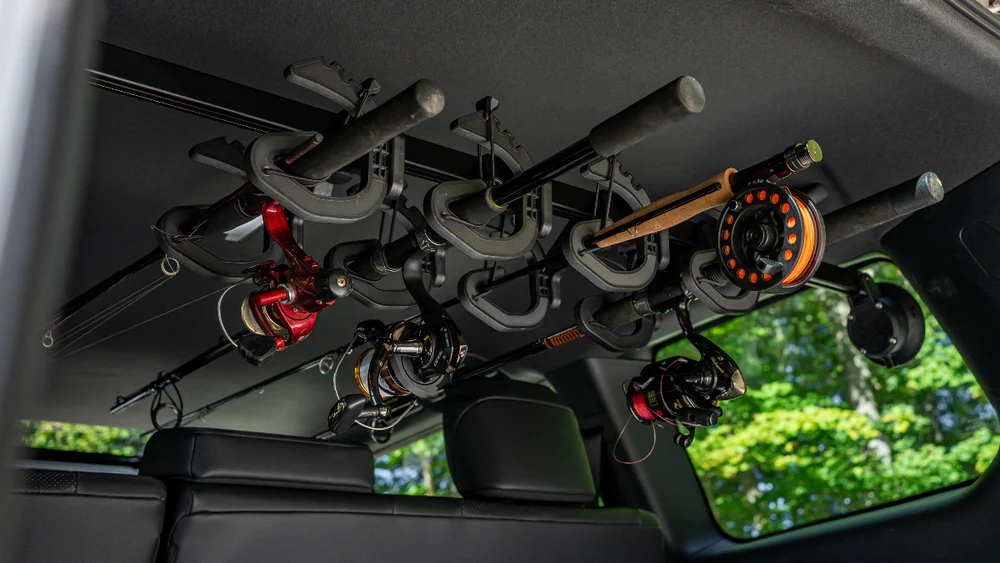 Utilizes overhead space inside the vehicle to keep rods organized and out of the way.