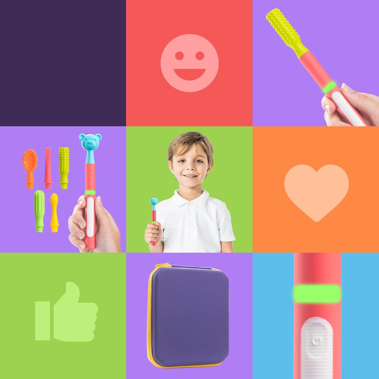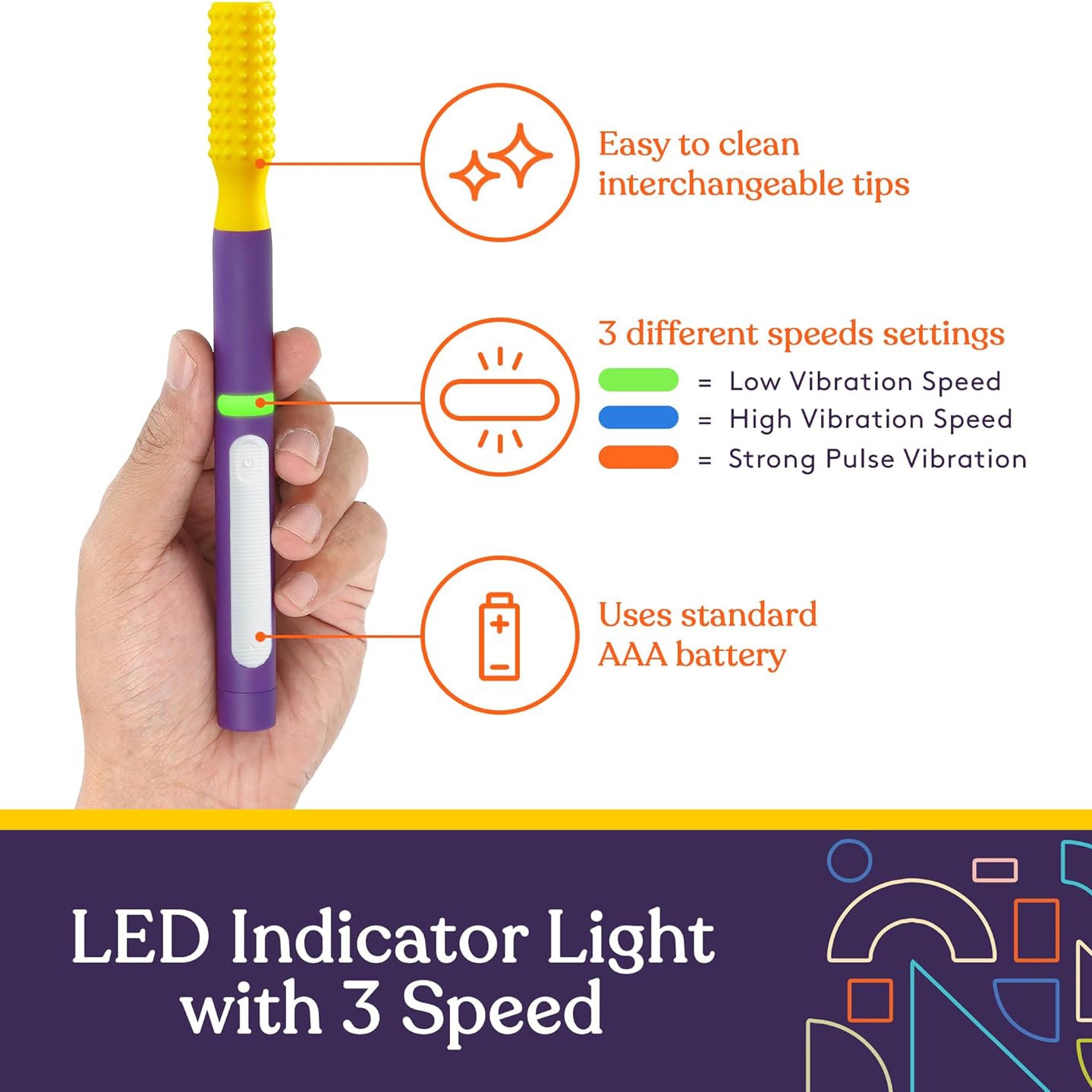 • Function: Soft vibration, sensory stimulation for mouth, jaw, and gums